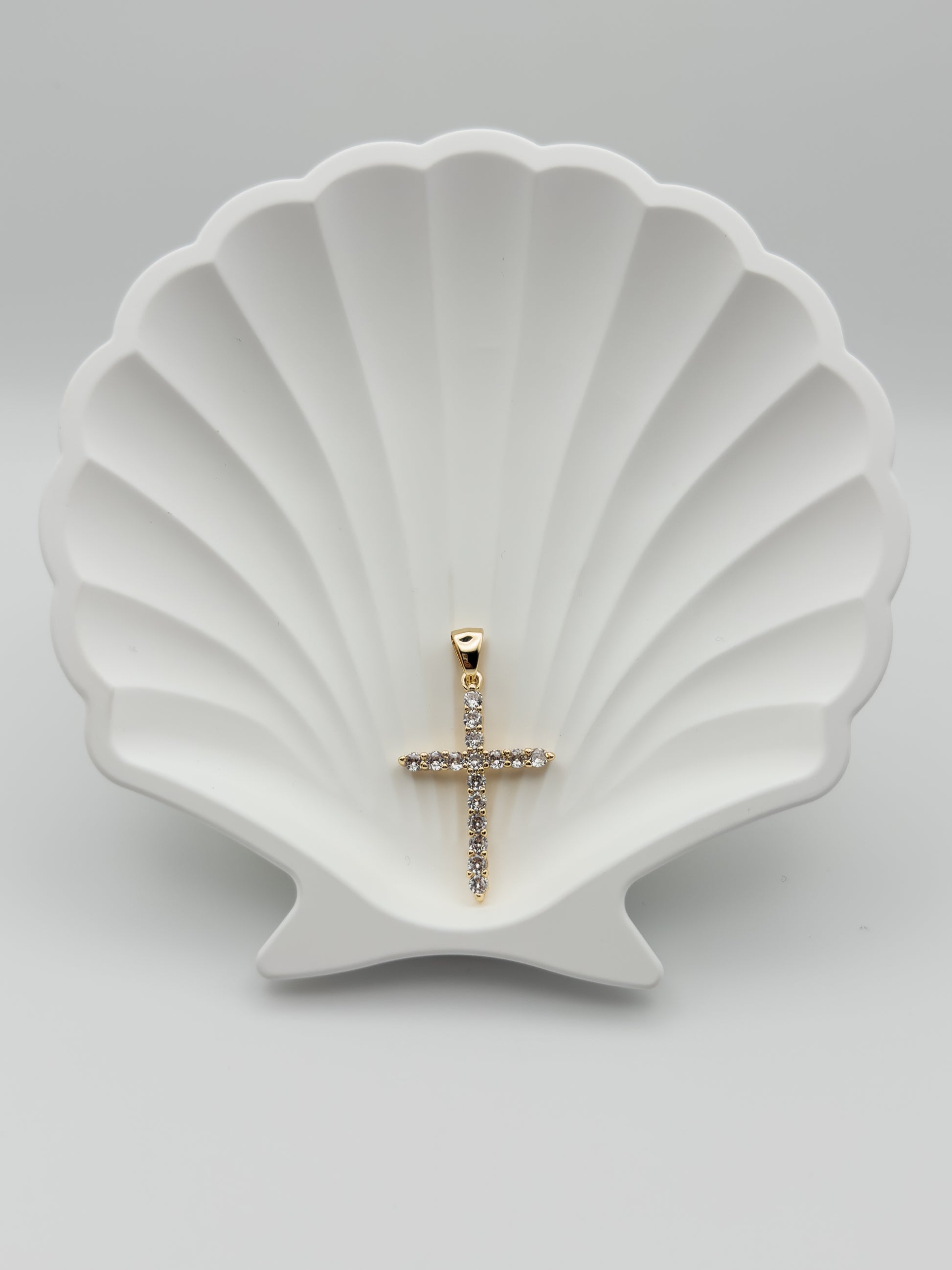 Dije de cruz en oro laminado con cristales brillantes redondos, que ofrece un diseño deslumbrante y atemporal.