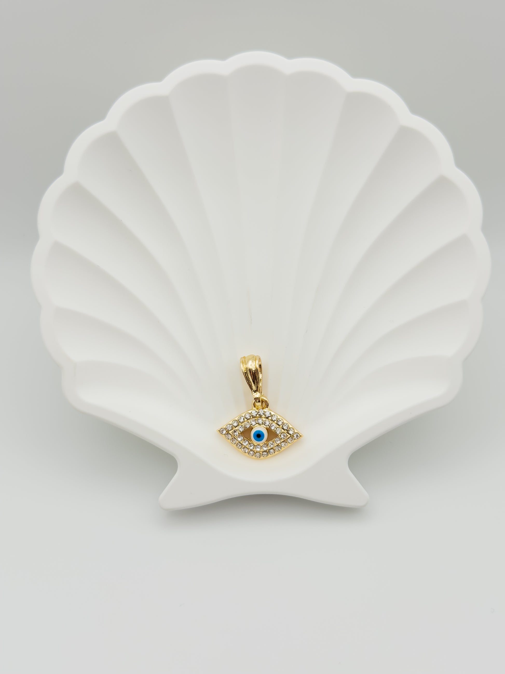 Dije de ojo turco en oro laminado con cristales transparentes y un ojo azul en el centro que simboliza protección.