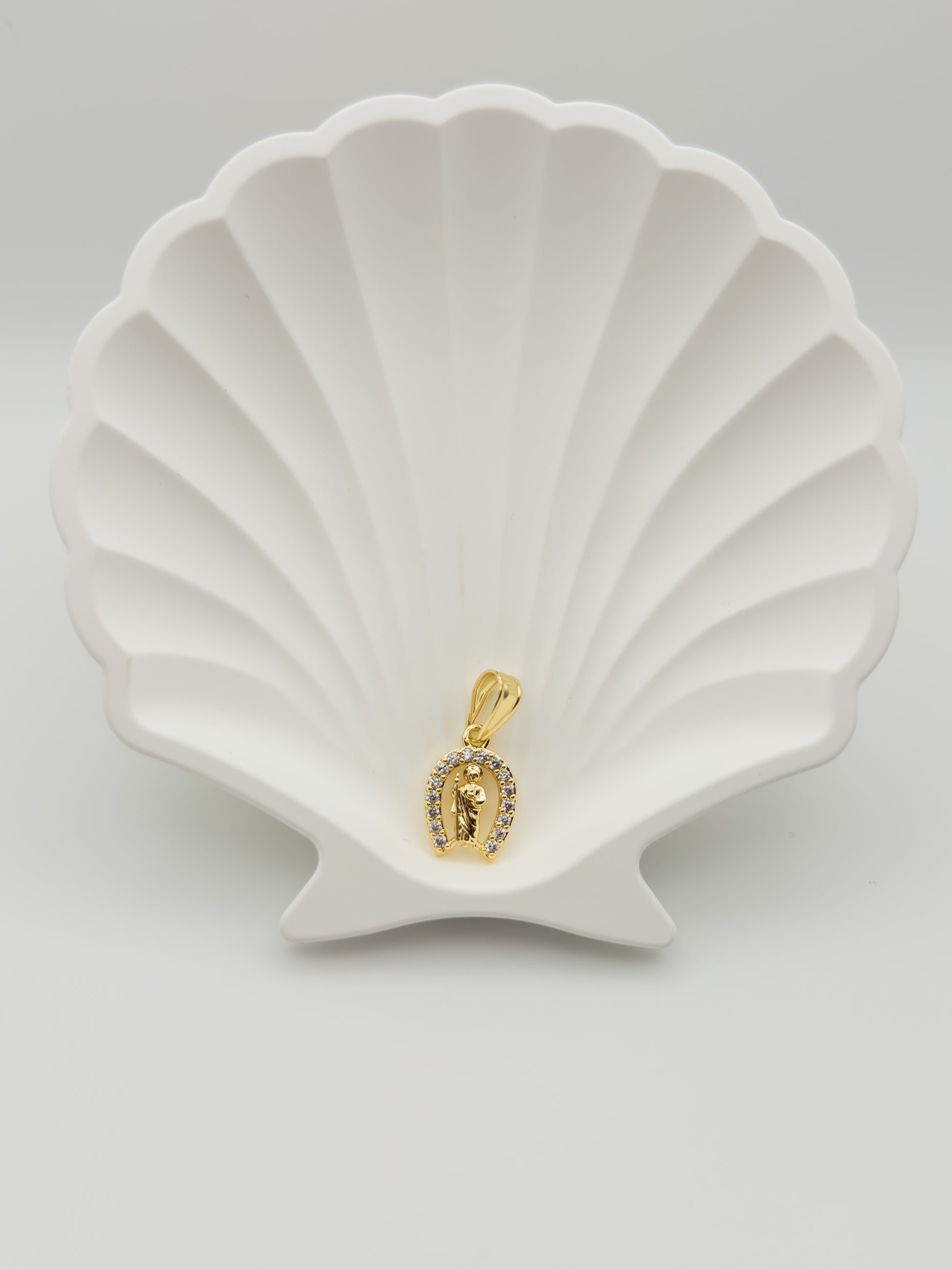 Dije de Herradura en oro laminado con un diseño detallado de San Judas, adornado con cristales transparentes para un toque de elegancia