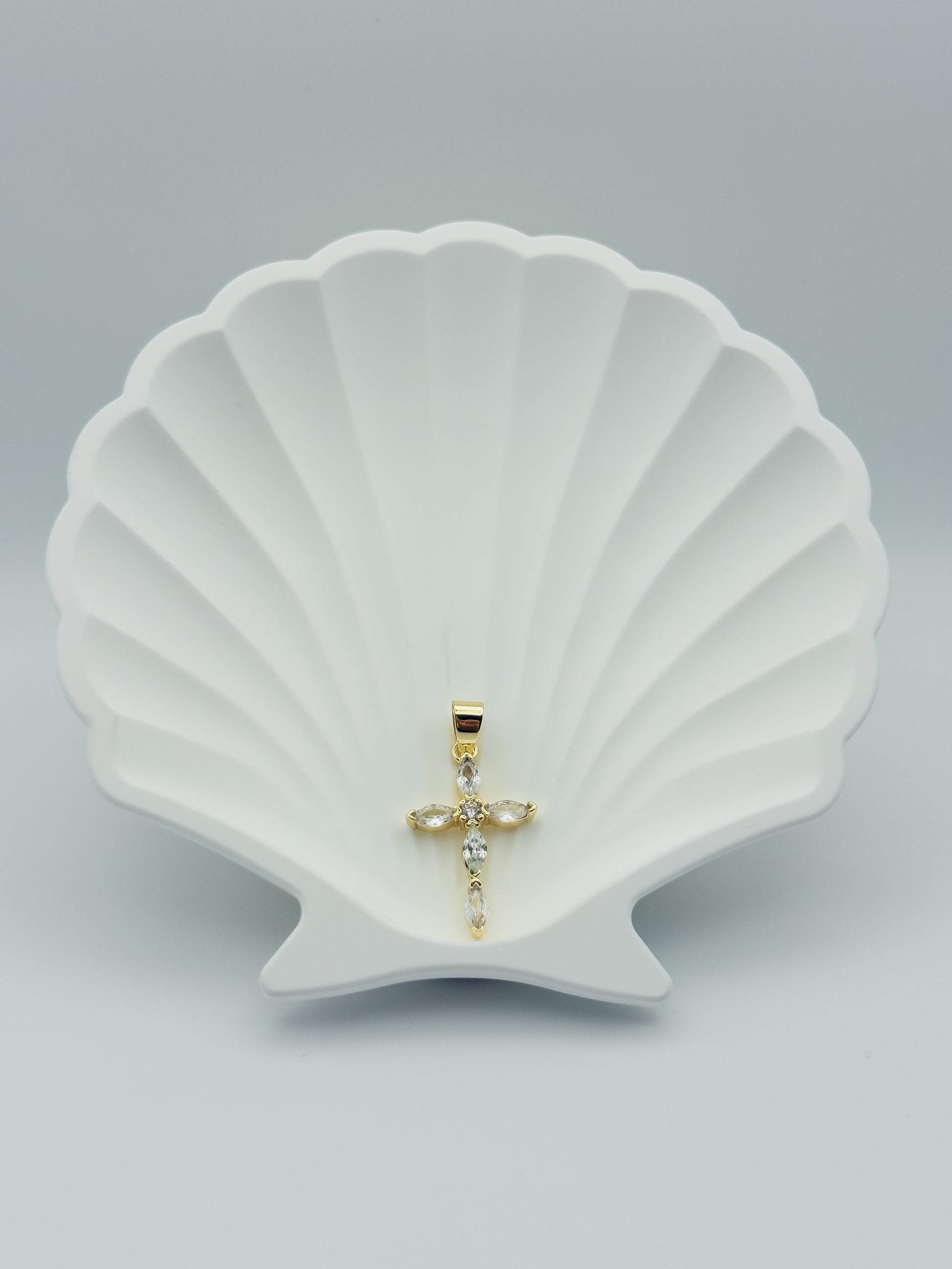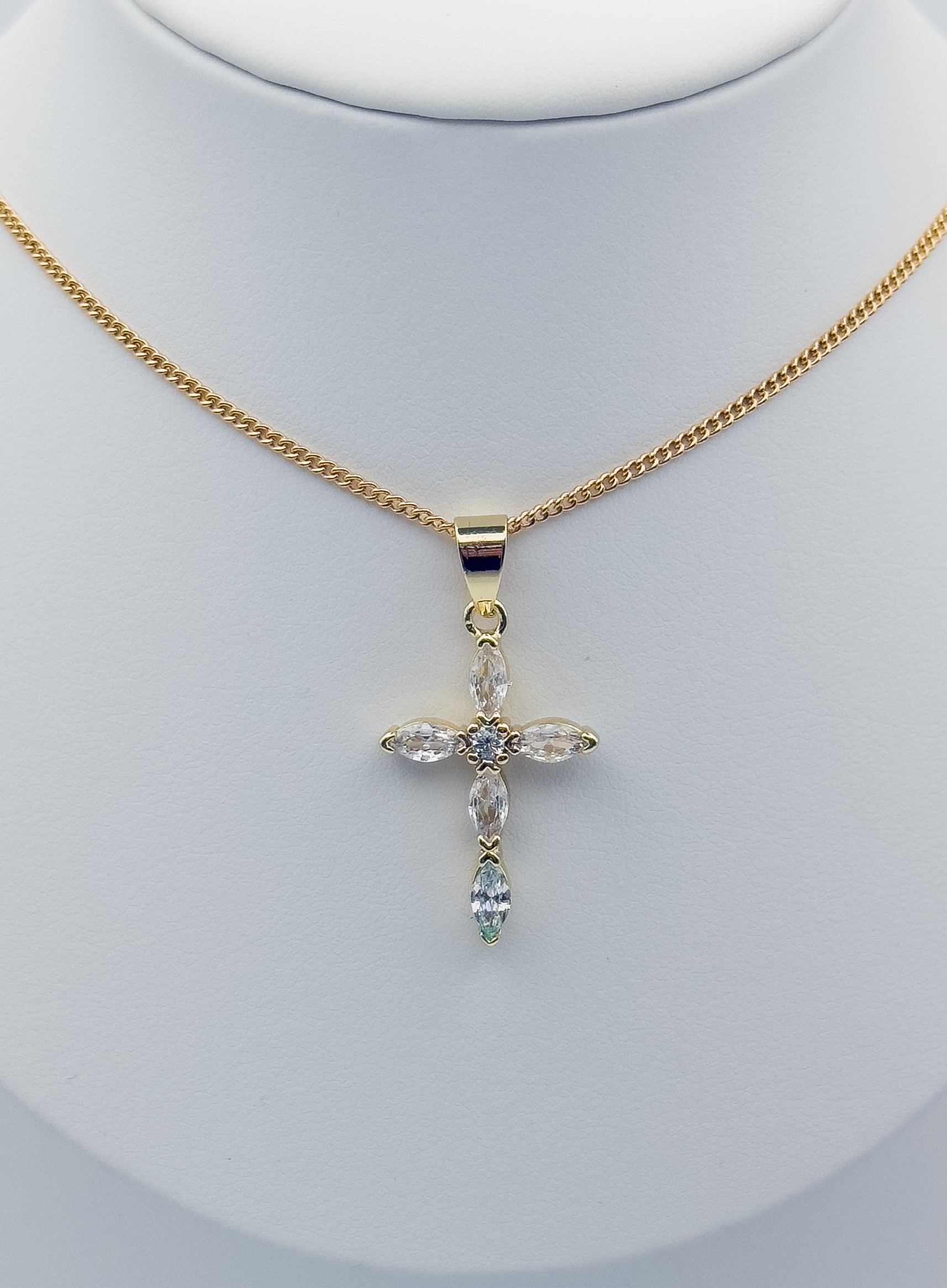Dije de cruz en oro laminado con piedras de circonia transparentes.